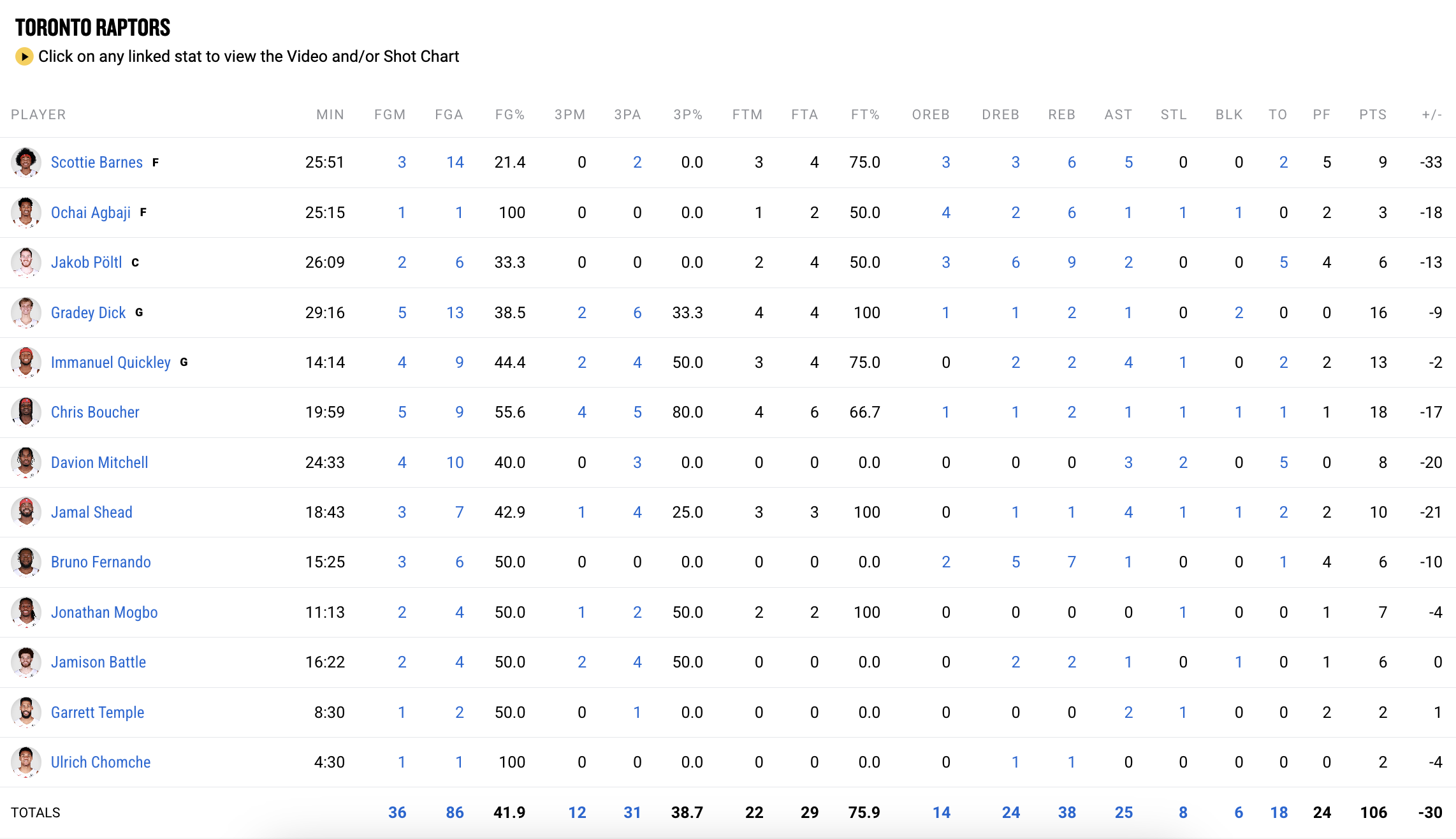 토론토는 임마뉴엘 퀵클리의 부상으로 또 다른 악재를 맞았습니다. 퀵클리는 14분 동안 13점을 기록하는 활약을 보였으나, 2쿼터에 상대 파울로 인해 넘어지면서 오른쪽 골반에 타격을 입고 더 이상 경기에 나서지 못했습니다. 랩터스 측은 퀵클리가 오른쪽 골반 타박상으로 인해 경기에 복귀하지 못한다고 발표했습니다.