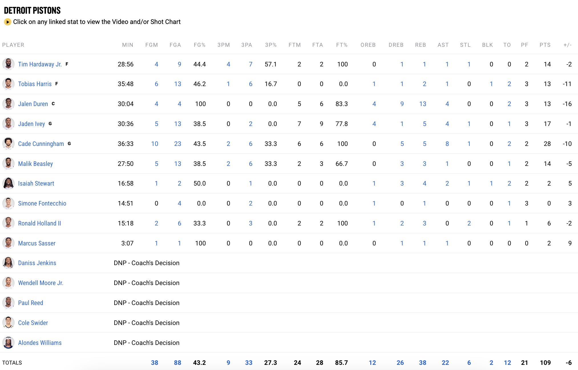 디트로이트 피스톤스는 케이드 커닝햄이 28점으로 팀 내 최고 득점자로 활약했으며, 그 중 22점은 후반전에 기록되었습니다. 팀 하더웨이와 말릭 비즐리는 각각 14점, 토바이어스 해리스는 13점을 기록하며 안정적인 플레이를 펼쳤습니다. 특히 해리스는 디트로이트에서 두 번째로 뛰는 첫 경기에서 괜찮은 성적을 남겼습니다.