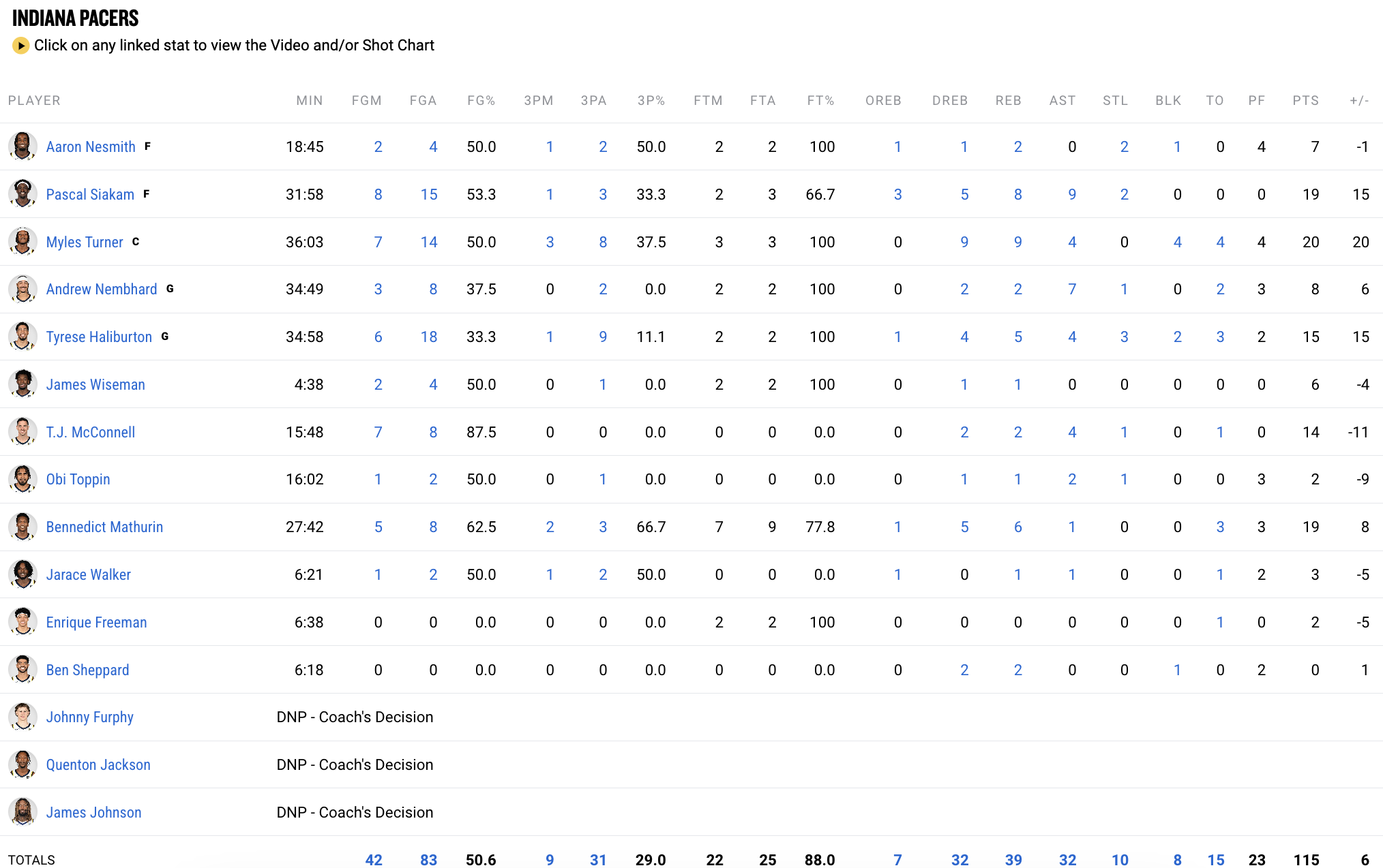 마일스 터너는 팀에서 가장 많은 20점을 기록했고, 파스칼 시아캄과 베네딕트 매서린은 각각 19점을 추가하며 팀의 득점을 이끌었습니다. 타이리스 할리버튼은 15점을 기록했고, T.J. 맥코넬은 벤치에서 14점을 더하며 팀의 역전승에 큰 기여를 했습니다.