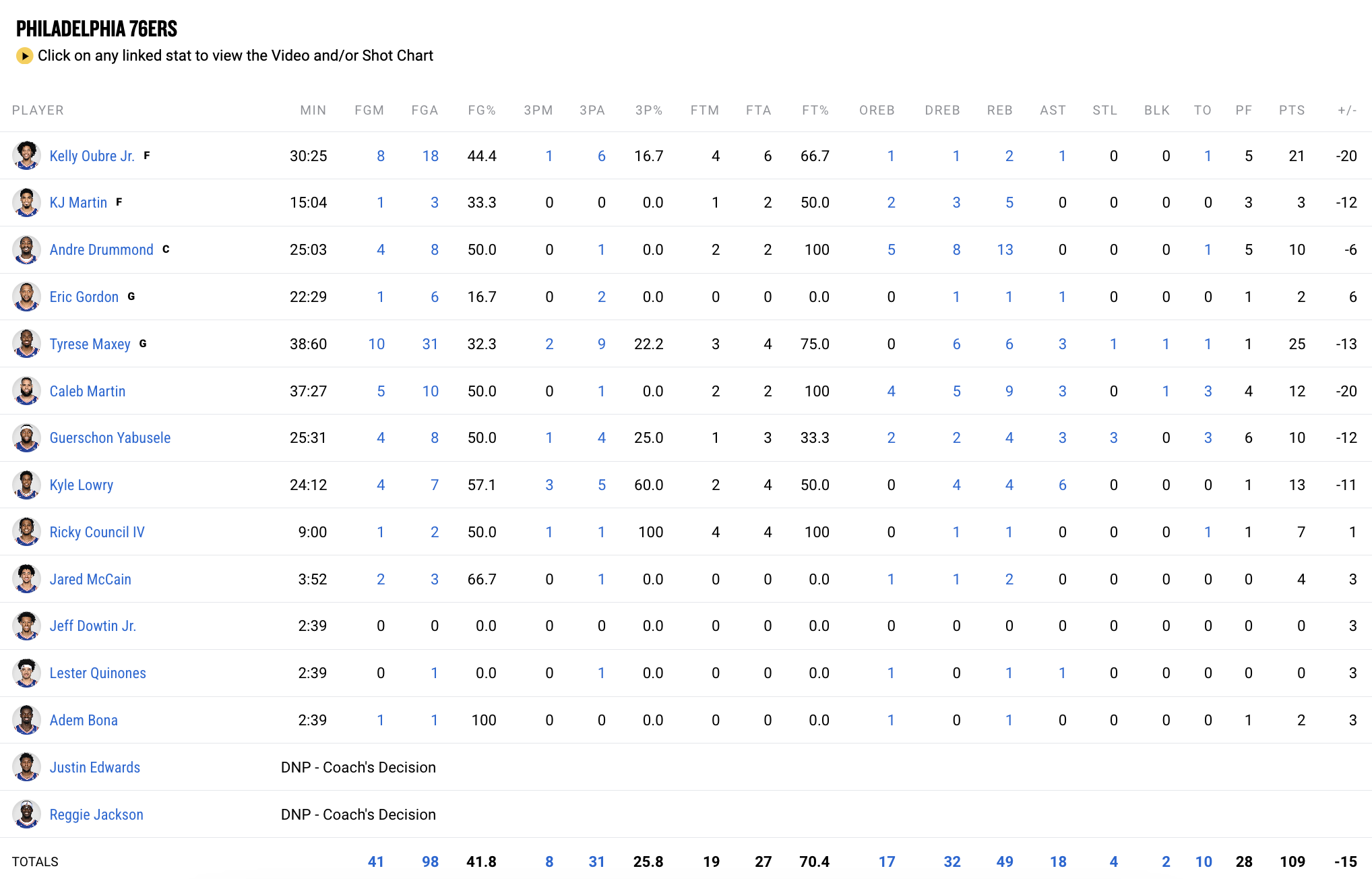 필라델피아는 조엘 엠비드와 폴 조지가 무릎 부상으로 결장하며 힘든 경기를 치렀습니다. 타이리스 맥시는 25점을 기록하며 팀을 이끌었고, 안드레 드러먼드는 13점과 11리바운드로 더블더블을 기록했지만 팀의 패배를 막기엔 역부족이었습니다. 필라델피아는 경기 중반 벅스의 강한 수비와 빠른 공격에 고전하며 점수를 따라잡지 못했습니다.
